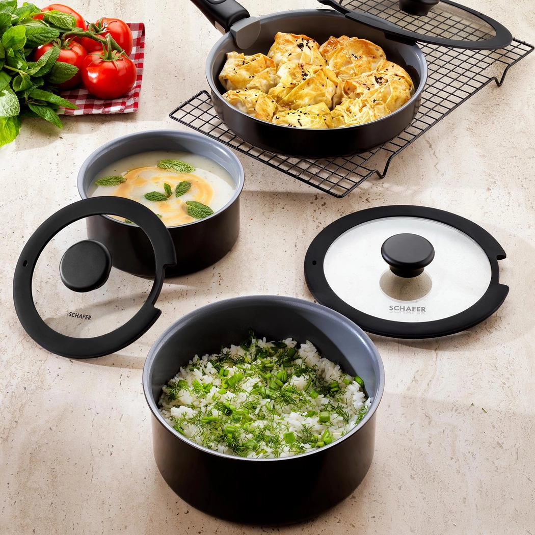-Veshje qeramike e përforcuar në një trup alumini që shpërndan nxehtësinë në mënyrë të barabartë, duke siguruar rezistencë shtesë ndaj gërvishtjeve dhe ngjitjes.